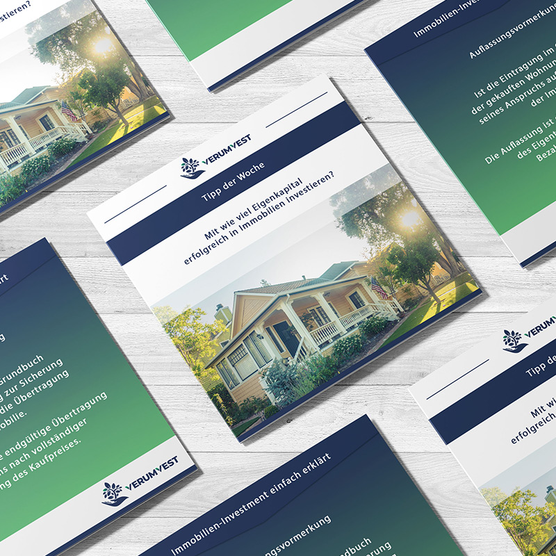 Die Verumvest GmbH ist in der Immobilienbrache tätig und veröffentlicht regelmäßig spannenden Content zu den Themen Immobilieninvestment, Finanzielle Bildung und Kapitalanlage. Damit diese spannenden Inhalte nicht nur auf der Webseite zu finden sind, wird seit 2019 aktiv Social Media Marketing betrieben. Jede Woche gibt es auf den Kanälen der Verumvest somit spannende Tipps, Blogartikel, E-Books zum kostenlosen Download, Zitate zu den o.g. Themen und weitere wissenswerte Infos rund um die Immobilienbranche.